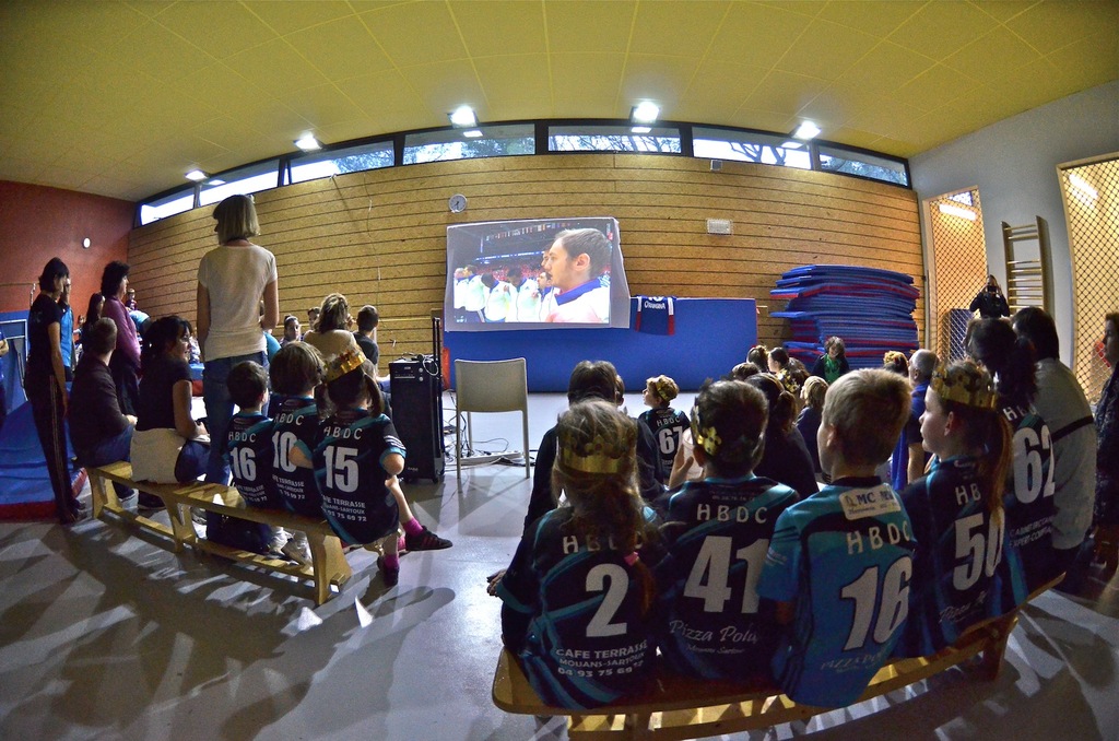 -17h30, tous devant le match. Le HBDC a mis en place, à la dernière minute, un écran de fortune avec un vidéoprojecteur et une parabole sur trépied (merci à Cyril !!) pour permettre à tout le club de partager le nouveau sacre de cette fantastique équipe de France masculine, qui remporte là son 9ème titre international et sa 9ème finale d’affilé, devant des enfants et des adultes en liesse !